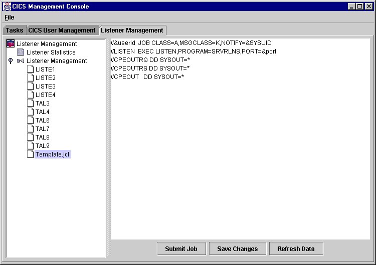 This option enables you to select from a list of mainframe listener jobs, create a new job file, submit a job, save changes, or update job data. You can define new instances of listeners. For example, you might have an iPlanet Application Server server that needs to relay conversations to different mainframes on separate SNA networks, such as a mainframe used for testing and another used for production. In this case, you could define different job files and select the appropriate job depending on whether the server is in "test" or "production" mode.The job files will be displayed on the local file system. When submitted, they will be transmitted to the mainframe via FTP, and submitted there.