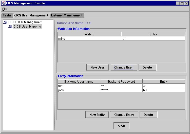 From the CICS Management Console window, click the CICS User Management tab. The User Mapping Management tree file appears on the left, and the Data Source Name backend information appears on the right.![]()