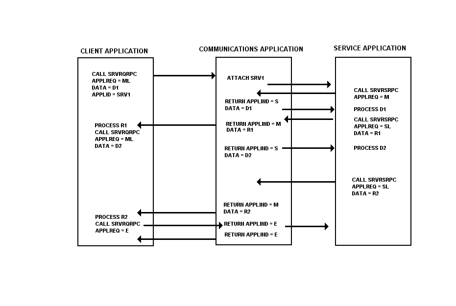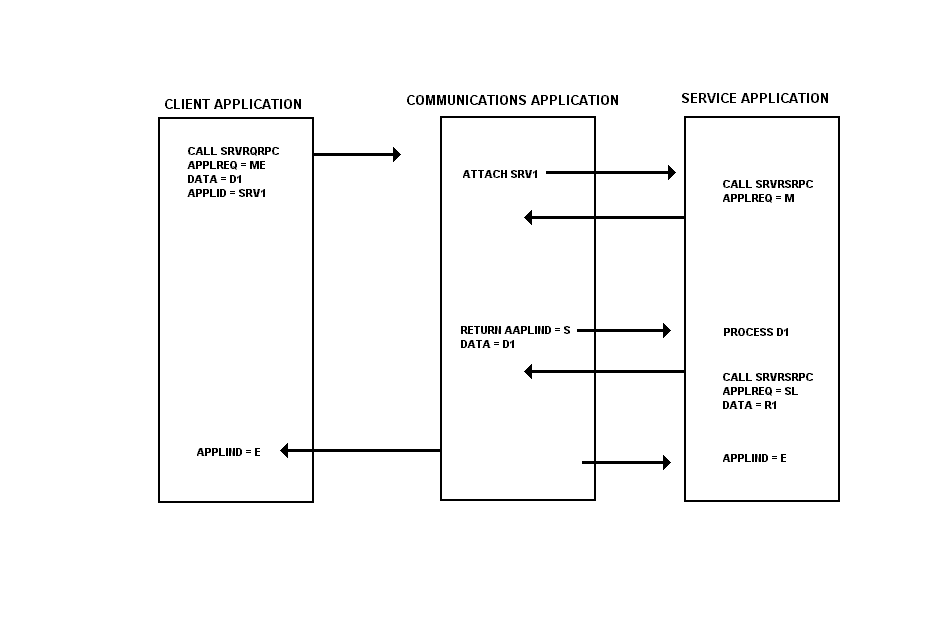 The client application calls the communication API with an ME, indicating that the service application is SRVI and provides the request in the data field of the connection record (D1). The service application is initiated and immediately calls the communication API with an M in the applreq (this is the only thing that the service application can do in the E state). The communication API returns to the service application with the request data (D1) and with the indication S, meaning that the service application is now the sender.