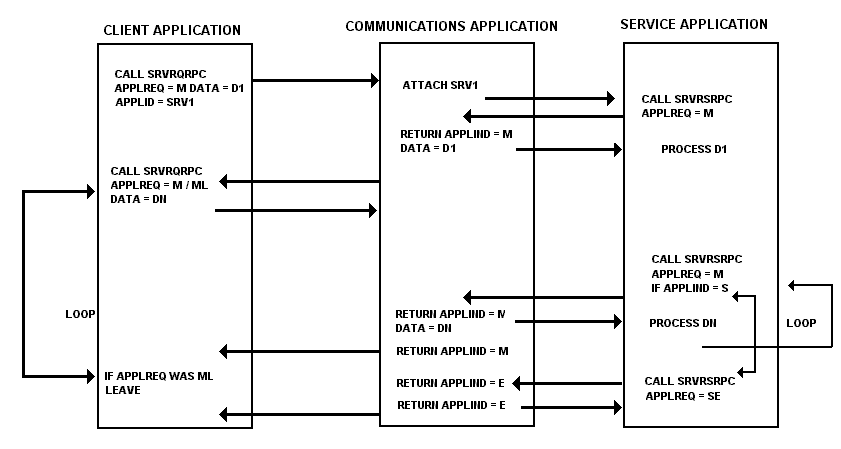 The client application starts the conversation with an ML request which is the same as ME except that the conversation is not automatically ended. The service application is initiated and, as always, issues an M request. the service application receives the first data (D1) and an applind indicating that it is in the S state. The service application then issues an SL request with the response to D! (R1). when the client application gets control back, it returns to the M state. The whole process can then be repeated. In this case, when the client and service applications obtain control they are always in control of the conversation. When the client application has no more requests, it issues the applreq E, at which point the communication API responds with an applind E to both sides of the conversation.