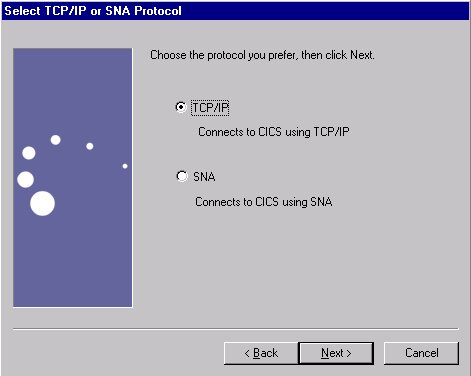 - Choose the protocol you prefer, either TCP/IP or SNA protocol, by marking the appropriate button, and then click Next. See Figure 2-5.