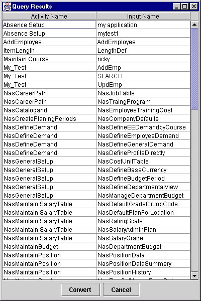 The Query Results window lists the activity name and the input name of the PeopleSoft Message Definition as seen in Figure 3-6.The following procedure converts the PeopleSoft Message Definition to an XML file and loads it into the repository.
