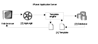 In response to the request, an AppLogic runs. The AppLogic specifies a query and passes the query and the name of an HTML template file to iPlanet Application Server's Template Engine.