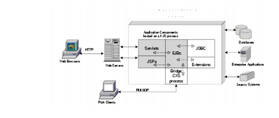 You must add a CXS (Bridge) process to iPlanet Application Server, if Corba-based clients are to communicate directly with EJBs hosted on a KJS process via the Internet Inter-ORB Protocol (IIOP). Typically, requests are made through a web path where they originate at a Web Browser and are then processed by JSPs and servlets, which in turn access EJBs. This web path uses the HTTP protocol. In the case of Corba-based clients, requests are made through the JavaSoft ORB directly to EJBs using the CORBA Executive Server (CXS), a Java engine within iPlanet Application Server, which acts as a bridge between Corba-based clients and EJBs. For more information about developing and deploying Corba-based clients, see the Developer's Guide.The following figure depicts the communication architecture within iPlanet Application Server, and the communication between Corba-based clients and EJBs in the server, using the CXS bridge process..