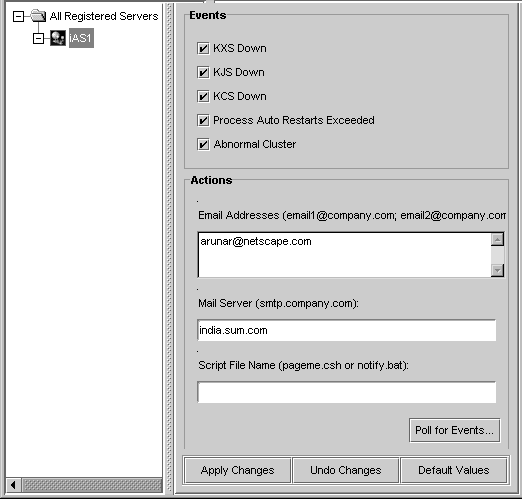 Event notification is useful when you cannot actively monitor an iPlanet Application Server. This passive monitoring system is activated only in critical circumstances, such as when a process has failed.You can set the system to alert one or more concerned parties through email when a critical situation arises by supplying the email addresses of those you want to alert. In addition, you can specify a script that will run automatically when certain events occur.