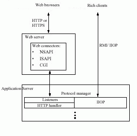 Protocol managerWhen a request comes in from a web browser, the request is passed to the web server via the HTTP or HTTPS protocol. The request is processed by the appropriate web connector. Web connectors include the NSAPI web connector, ISAPI web connector, and optimized CGI web connector for iPlanet, Microsoft, and CGI-compatible web servers, respectively.