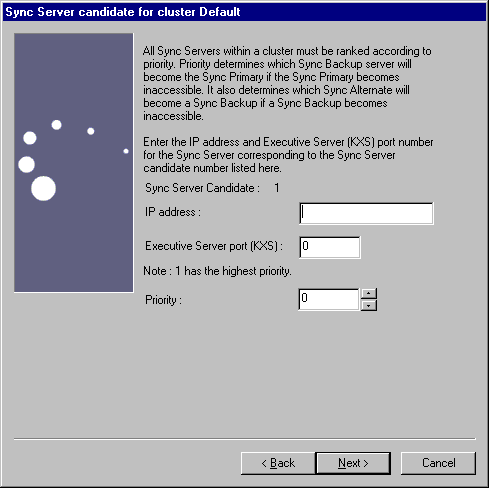 If this server is a synchronization server (you selected Sync Server in the previous step) enter its IP address, Executive Server (KXS) port number, and its priority number for taking over as the primary synchronization server.