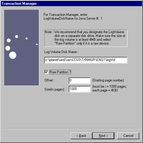- If the log volume is a raw partition, indicate Offset (starting page number) and Size (number of pages) in the raw partition. Make sure the size allocated for the log file is greater than 4 MB; the file should be greater than or equal to 1000 pages, at a size of roughly 4 KB per page.