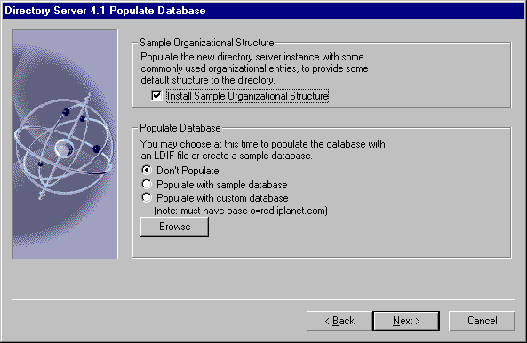 - If you have a custom database, select the Populate with custom database option > click Browse. Enter the full path and filename of a file in LDIF format to populate the directory with the custom database.