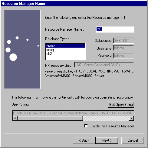 - Configure one resource manager for each database back end that you want to connect to. Resource manager lets you connect to a database back end for global transactions. For more information on configuring the Resource Manager, see "Configuring the Resource Manager".