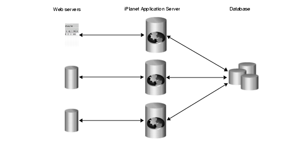 Hosting applications locally on multiple servers is the simplest of the three most common server configurations. In this configuration, you deploy the complete application on each iPlanet Application Server machine. If the application is already installed on an iPlanet Application Server machine, you can use the Deployment Tool to deploy the application to other servers.This configuration requires that you configure each web connector plug-in to forward requests to the appropriate iPlanet Application Server machine.
