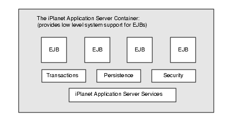 In an iPlanet Application Server, EJBs are the application workhorses. Servlets act as the application's central dispatchers and handle the presentation logic. EJBs do the bulk of the application's actual data and rules processing, but provide no presentation or visible user interface services. EJBs enable partitioning of business logic, rules, and objects into discrete, modular, and scalable units. Each EJB encapsulates one or more application tasks or objects, including data structures and operation methods. EJBs take parameters and send back return values.EJBs always work within the context of a container, which serves as a link between the EJBs and the server that hosts them. The iPlanet Application Server software environment provides the EJB container. This container provides all standard container services denoted by the Sun EJB specification and also provides additional services specific to an iPlanet Application Server.