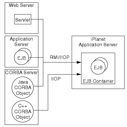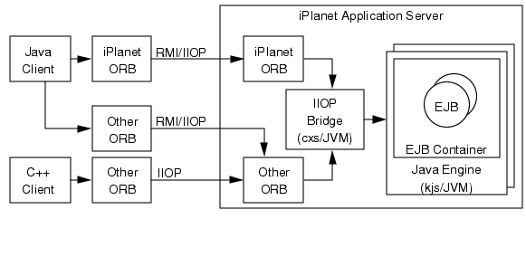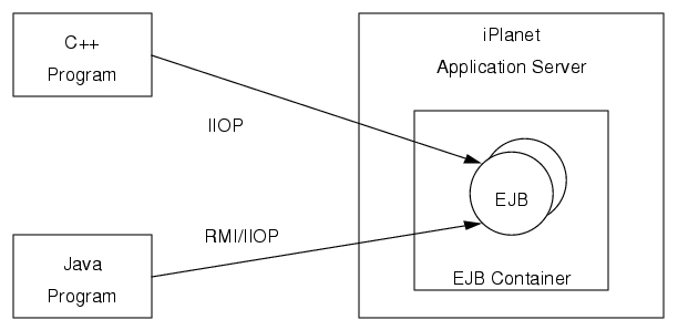 iPlanet Application Server supports access to EJBs via the IIOP protocol as specified in the Enterprise JavaBeans Specification, V1.1, and the Enterprise JavaBeans to CORBA Mapping specification. These clients use JNDI to locate EJBs and use Java RMI/IIOP to access business methods of remote EJBs, or they use C++ with IIOP to access business methods of remote EJBs.The following topics are covered in this overview:
