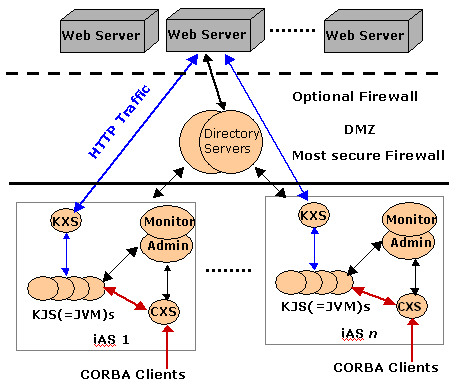 iPlanet Application Servers are typically deployed together with web servers, directory servers, and client database applications. In this scenario, inter-process communication is of a very high level and this makes data integrity and security issues very important. To ensure smooth and secure communication between application servers, web servers and the client applications that run on application servers, security components of the system are frequently separated by firewalls.The basic component of iPlanet Application Server is the Executive Server (KXS) which creates the components of the application, manages per-session data, load monitoring and load balancing functions with other instances of iPlanet Application Server.