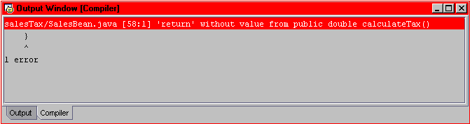 A compile error appears in the Output Window since you added a business method, but did not identify a return statement.