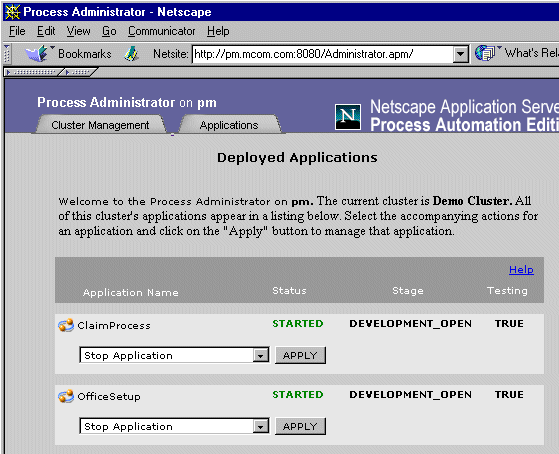 Process Manager includes another set of web-based interfaces, called Process Administrator and Business Administrator, for performing administrative duties, such as shutting down deployed processes. Figure 1-4 shows one of the administrative interfaces.