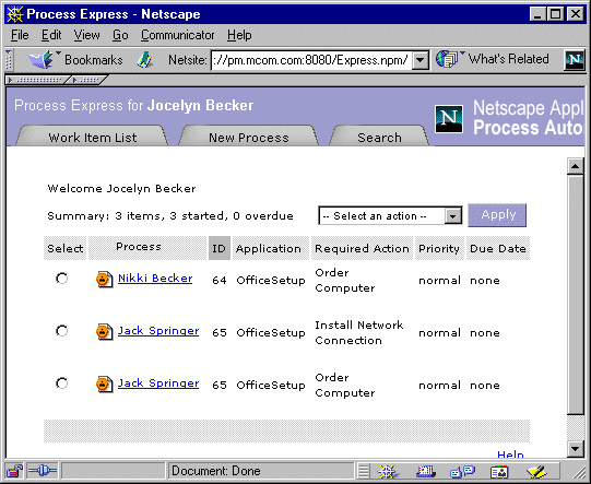 When the process is deployed, Process Manager routes tasks at each step in the process to the people that need to perform them. Process Manager uses a web-based interface, called the Process Express, to interact with the people involved in the process. The Process Express displays a web-based work list (much like an inbasket or to do list) to let a person know that a task has been assigned to them, as illustrated in Figure 1-2.