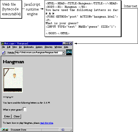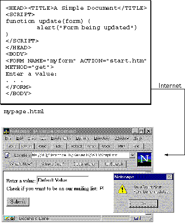 Web browsers such as Navigator (2.0 and later versions) can interpret client-side JavaScript statements embedded in an HTML page. When the browser (or client) requests such a page, the server sends the full content of the document, including HTML and JavaScript statements, over the network to the client. The browser reads the page from top to bottom, displaying the results of the HTML and executing JavaScript statements as they are encountered. This process, illustrated in the following figure, produces the results that the user sees.