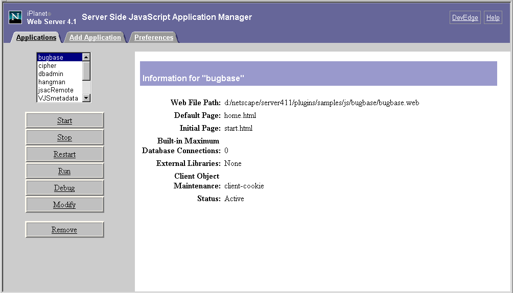 The functionality of the JavaScript Application Manager has not changed in iPlanet Web Server 4.1 compared to Enterprise Server 3.x. However, it uses the same new color scheme as the Server Manager and it has some minor layout rearrangements.Figure 1 shows the JavaScript Application Manager in iPlanet Web Server 4.1.