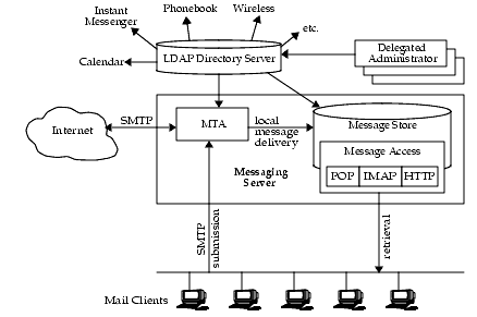 Email messages are delivered by the MTA to the Message Store. Access to the Message Store is provided by Message Access; a server within the Messaging Server. Message Access allows access to the Message Store via HTTP, POP, or IMAP.Messaging Server provides the foundation for unified messaging services through the storage of email, voice mail, and faxes in one universal Message Store. Access to the message store is available through multiple devices (telephones, PDAs, etc.) and protocols (HTTP, POP, IMAP). The Message Access component is responsible for handling the retrieval of messages from the Message Store.