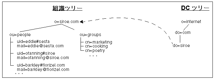 インストールされた、iPlanet Messaging Server ネームスペースは、組識ツリーおよびドメインコンポーネント ツリー (DC ツリー) の 2 種類のディレクトリ ツリーで構成されます。組識ツリー (別の 組識ツリーを追加してシステムをサポートすることもできます) には、ユーザおよびグループエントリが含まれます。DC ツリーは、ローカル DNS ストラクチャをミラー化し、データエントリのインデックスとしてシステムで使用されます (図 1-1 を参照)。DC ツリーは、スマートホスト、ルーティング、ホスト、ドメインディスク制限値などさまざまなドメインのオペレーティングパラメータも指定します。