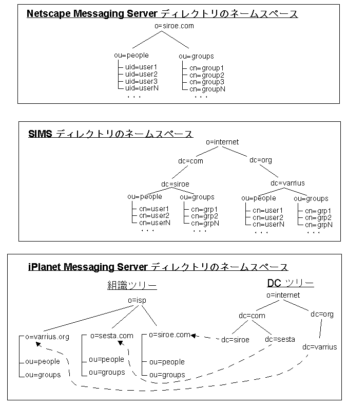 iPlanet Messaging Server のデフォルトの DIT は、Netscape Messaging Server および SIMS のディレクトリ DIT とは異なります。3 つの DIT を以下に示します。