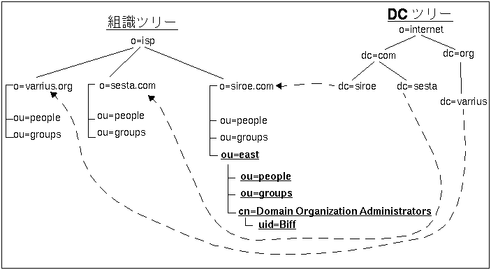 dn:cn=Organization Administrators,ou=groups,ou=east,o=siroe.com,o=isp