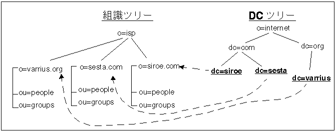 - ツリー内のディレクトリエントリを個別に識別する識別名 (dn)。 DC ツリーのデフォルト ルート ノードは o=internet です。