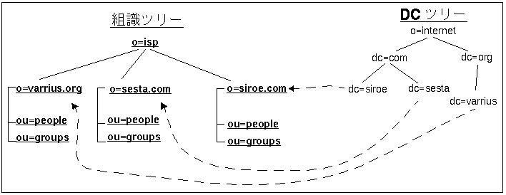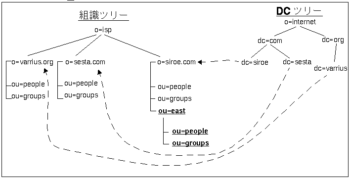 組織ツリーのルートエントリは、DC ツリーのルートエントリと同様にインストール時に作成されます。組織ツリーのルート名はインストーラによって指定できます。 このノードはインストール時に作成されますが、ここでは、説明のために LDIF を示します。