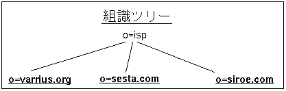 コード例 2-4 組織ツリー ルートの LDIF レコード dn: o=ISP objectClass: organization o: internet description: Root level node in the Organizational tree この例では、ルートエントリ DN として o=isp を使用します。属性の説明は、「DC ツリーのルートドメインエントリの作成」を参照してください。ACI 情報については、付録 A「ルートおよびドメイン ACI の例」を参照してください。