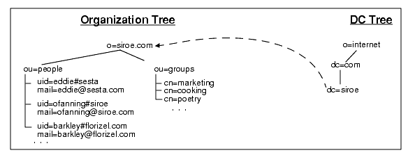 As installed, the iPlanet Messaging Server namespace consists of two directory trees, an Organization Tree and a domain component tree (DC Tree). Organization trees (additional Organization Trees can be added to support a system) contain the user and group entries. The DC Tree mirrors the local DNS structure, and is used by the system as an index to the data entries (see Figure 1-1). The DC Tree also specifies the various domain's operating parameters such as smart hosts, routing, hosts, domain disk quota, and so on.