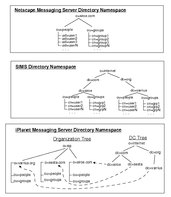 The iPlanet Messaging Server default DIT is different from the Netscape Messaging Server and SIMS directory DIT. The three DITs are shown below.
