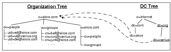 In the domain node entries dc=siroe,dc=com,o=internet and dc=varrius,dc=org,o=internet we added the attribute value pair inetDomainBaseDN: o=siroe.com,o=isp and inetDomainBaseDN: o=varrius.org,o=isp.