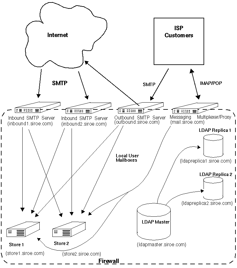 1 LDAP master for user/group data and iPlanet Messaging Server configuration information: ldapmaster.siroe.com (port 389 for user/group server and port 390 for configuration server)