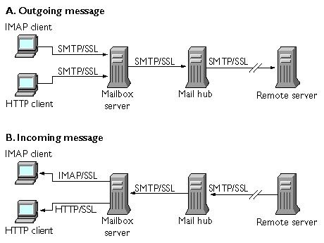 SSL functions as a protocol layer beneath the application layers of IMAP4, HTTP, and SMTP. SMTP and SMTP/SSL use the same port; HTTP and HTTP/SSL require different ports; IMAP and IMAP/SSL can use the same port or different ports. SSL acts at a specific stage of message communication, as shown in Figure 11-1, for both outgoing and incoming messages.