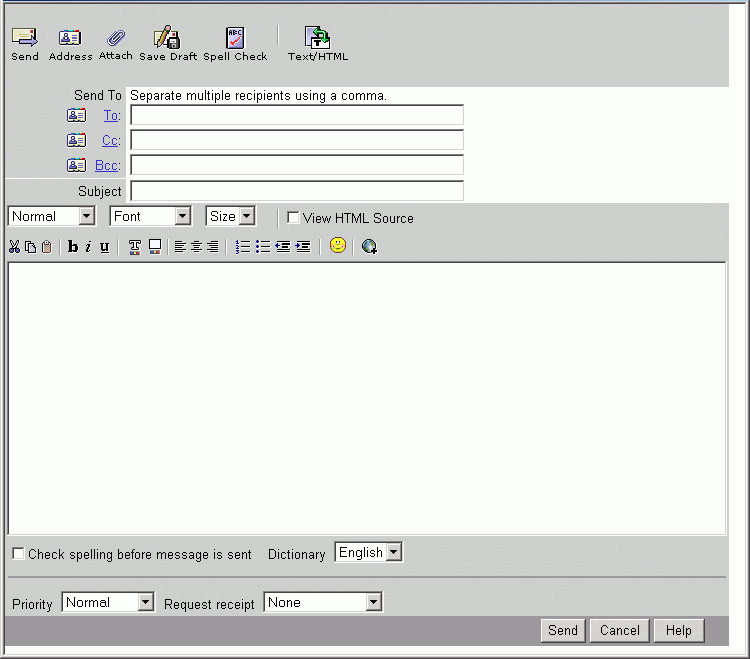 The Messenger Express composition window, shown in Figure 1-5, is used primarily to compose a new message. You can also use the window to save a draft or attach a file to the message, look up a recipient in the address book, access the help file, and cancel the composition altogether. Mail recipients can be added in "To", "Cc", or "Bcc" fields. You can edit the message in Text or HTML format and also check the spelling. The composition window also enables you to set the mail priority or request for a return receipt.