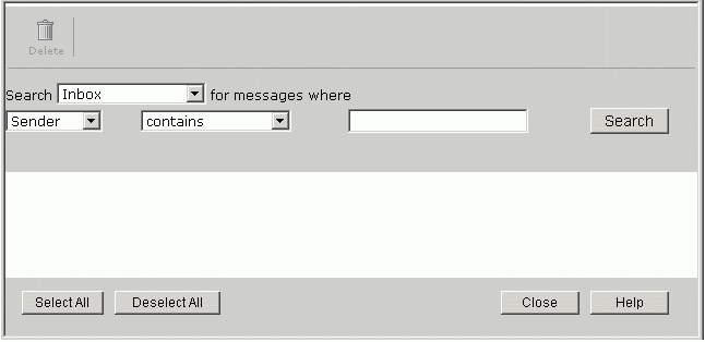 The Messenger Express message search window, shown in Figure 1-6, is primarily used to search messages by entering sender's name, subject, body text, or recepient's name. You can also delete the messages from the search list.