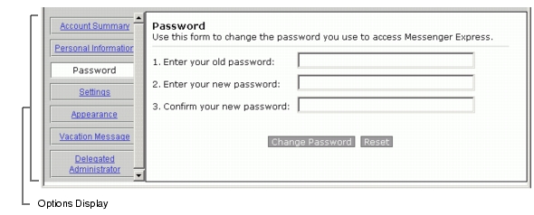 The Messenger Express Options screen, shown in Figure 1-4, enables access to the subscriber's account summary, personal information, password, settings, appearance, vacation message, and delegated administrator, all of which can be customized.