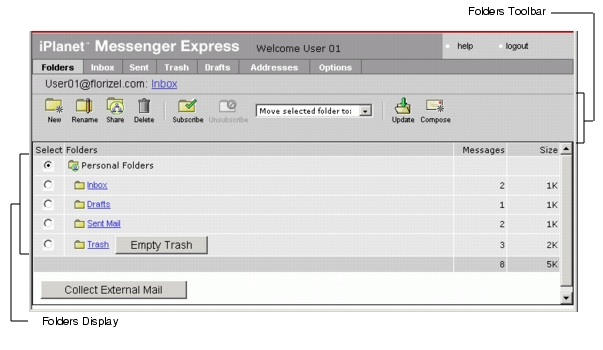 The Messenger Express Folders screen, shown in Figure 1-3, displays all folders that can be accessed. The Folders screen lists the number of messages contained and the size of each folder. The Folders screen also enables creating new folders, renaming or deleting old ones, subscribing or unsubscribing shared folder, sharing folder, moving a folder within another folder, updating the inbox, and composing new messages. Like the Inbox screen, the Folders screen also enables collection of external mails.