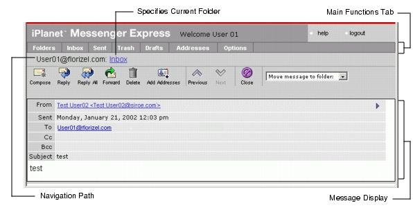 The Messenger Express message screen, shown in Figure 1-2, displays the message selected from the inbox screen. The message screen gives the option of replying to the sender(s), forwarding the message, moving the message to a different folder, or deleting the message. The message screen also enables navigation to the next or previous message.