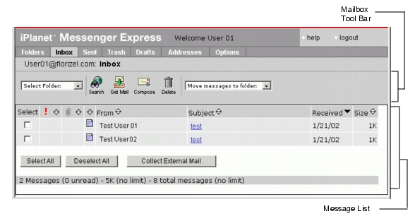 The Messenger Express inbox screen, shown in Figure 1-1, enables you to view all messages and its basic features for example, subject, from, received and size. The inbox screen gets new messages and enables you to search for or delete old messages, as well as move messages into other folders.