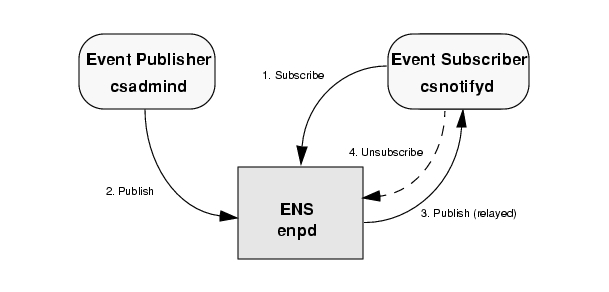 - Though the ability to unsubscribe is part of the ENS architecture, csnotifyd does not bother to unsubscribe to events for the following two reasons: there is no need to unsubscribe or resubscribe during normal runtime; and due to the temporary nature of the subscriptions store (it is held in memory), all subscriptions are implicitly unsubscribed when the connection to ENS is shutdown.
