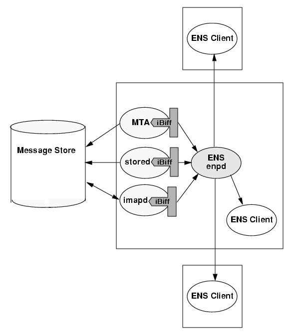 Notifications flow from the iBiff plug-in in the MTA, stored, and imap processes to ENS enpd. The ENS client subscribes to the ENS, and receives notifications. When iBiff is enabled, iPlanet Messaging Server publishes the notifications with the iBiff plug-in, but no iPlanet Messaging Server services subscribe to these notifications. A customer-provided ENS subscriber or client should be written to consume the notifications and do whatever is necessary. That is, iPlanet Messaging Server itself does not depend on or use the notifications for its functions, and this is why ENS and iBiff are not enabled by default when you install iPlanet Messaging Server.