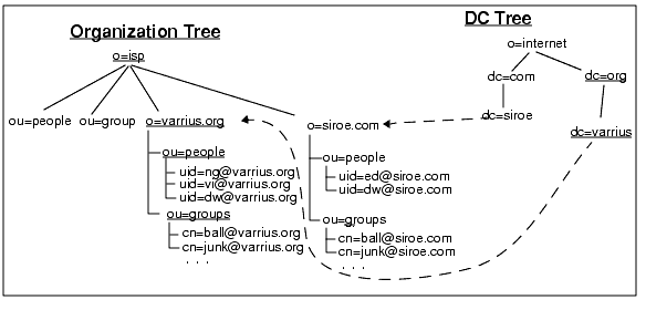 In the domain node entries dc=siroe,dc=com,o=internet and dc=varrius,dc=org,o=internet we added the attribute value pair inetDomainBaseDN: o=siroe.com,o=isp and inetDomainBaseDN: o=varrius.org,o=isp.
