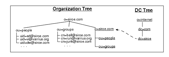 This namespace configuration will now support Delegated Administrator and hosted domains.In the Organization Tree we moved user and group entries from ou=people,o=siroe.com and ou=groups,o=siroe.com to ou=people,o=siroe.com,o=isp and ou=group,o=siroe.com,o=isp.
