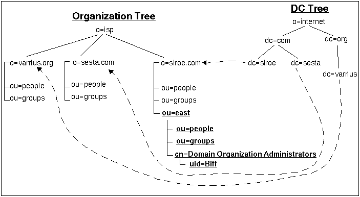 memberOf: cn=Organization Administrators,ou=groups,ou=east,o=siroe.com,o=isp