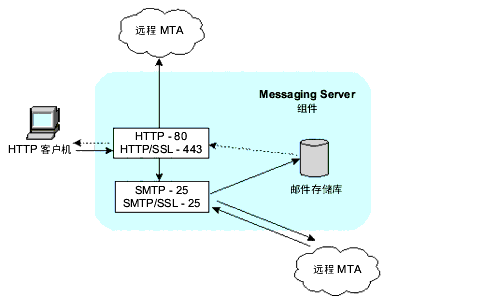 POP 和 IMAP 客户机可将邮件直接发送给 iPlanet Messaging Server MTA 进行路由选择或传递。而 HTTP 客户机则将邮件发送到一个专用的 web 服务器,该服务器是 iPlanet Messaging Server 的组成部分。HTTP 服务随后将邮件发送到本地 MTA 或远程 MTA 进行路由转换或传递,如图 3-1 所示。图 3-1 HTTP 服务组件