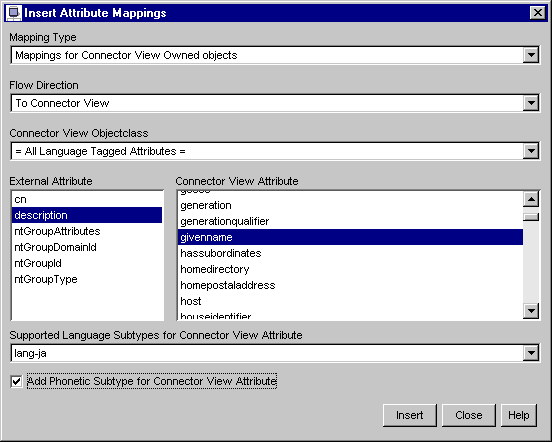 - If you specify All Language Tagged Attributes as the connector view objectclass, choose a supported language subtype. Check Add Phonetic Type box to indicate if the attribute value is a phonetic representation. For more information on these fields, see "To Compose Language Tagged Attribute Conditions" of Chapter 7 "Connectors and Connector Rules."