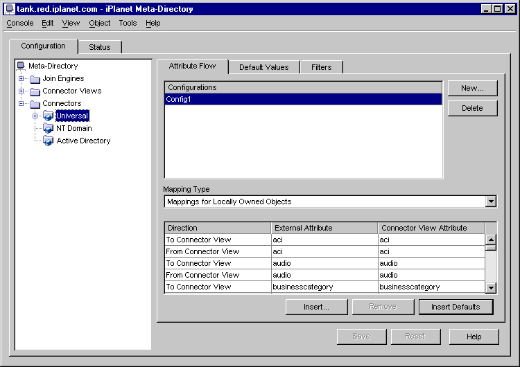 - Alternately, you can click Insert Defaults and Meta-Directory populates the list box at the bottom of the window with default mappings, in which the external data source attributes match the connector view attributes. These default mappings are the same as those chosen at the connector node in the General configuration window.