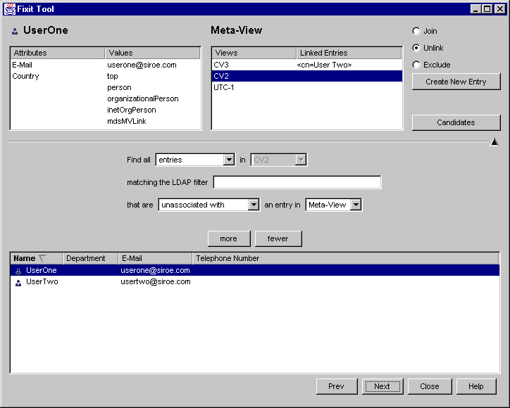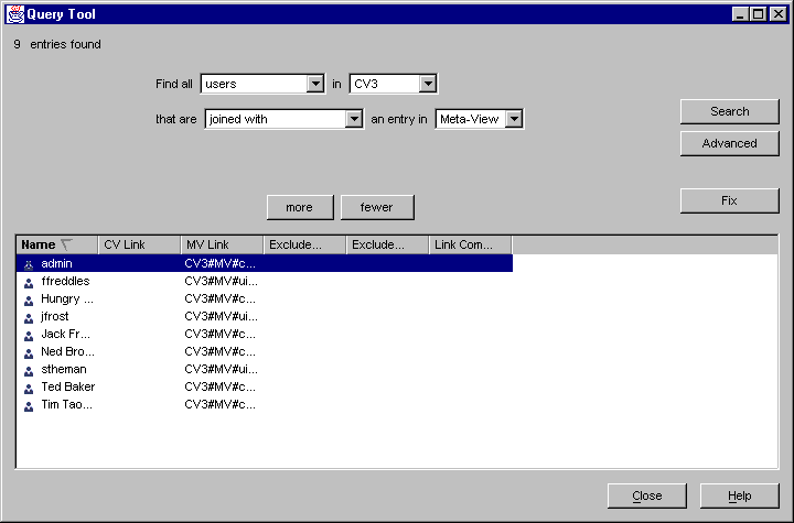 With the Fix-It Tool, you can create or delete manual links between entries when automated linking breaks. This allows an administrator to establish the linkages for hard to match entries or to review Meta-Directory's predetermined linking. You can also mark or unmark entries as excluded, and assign or remove ownership of an entry.